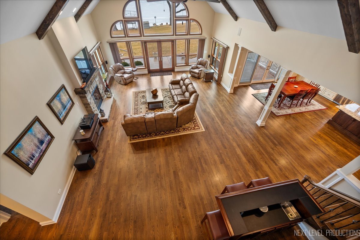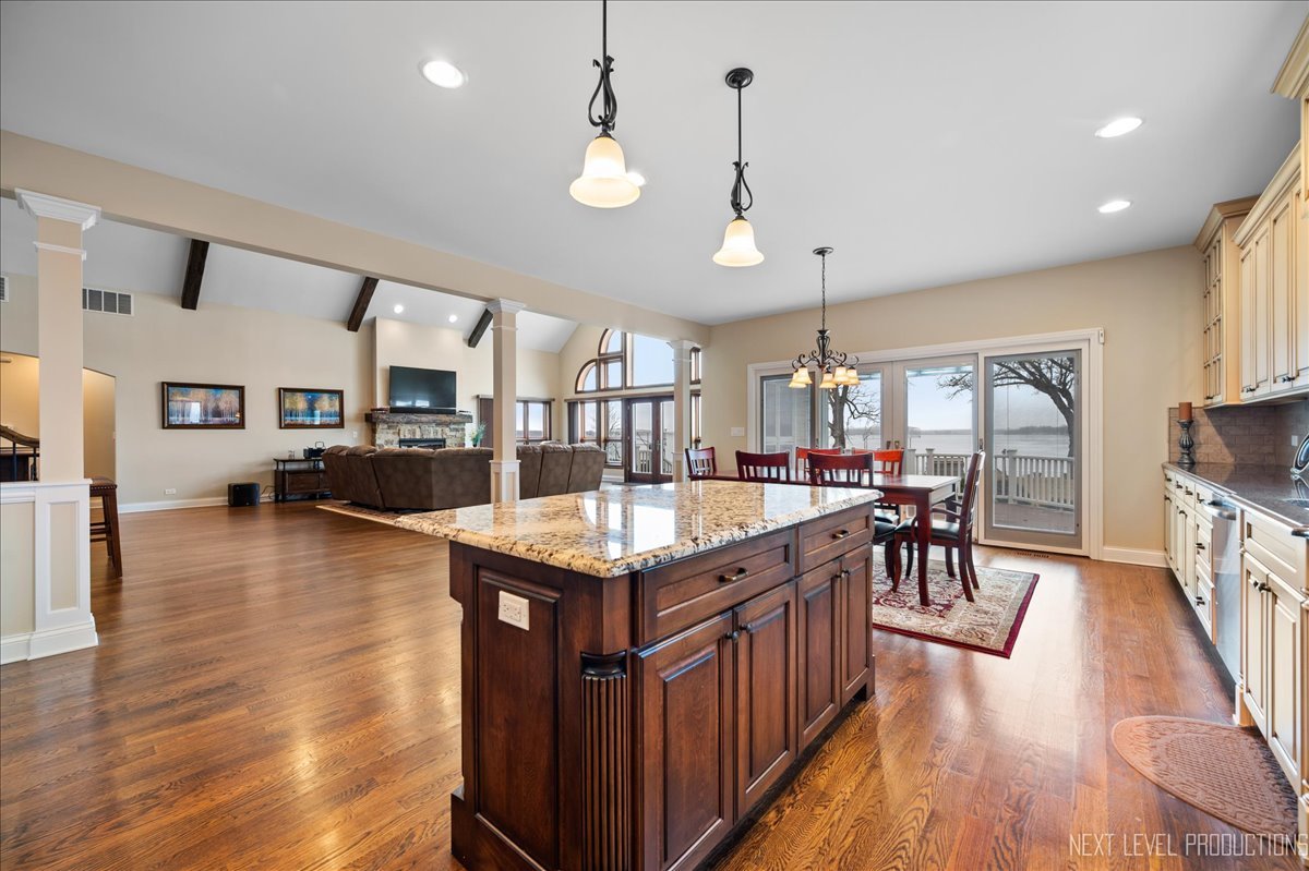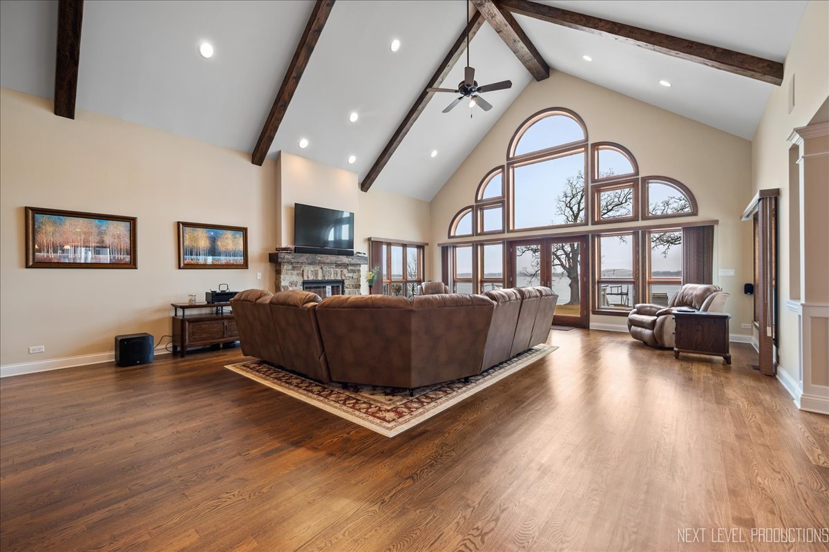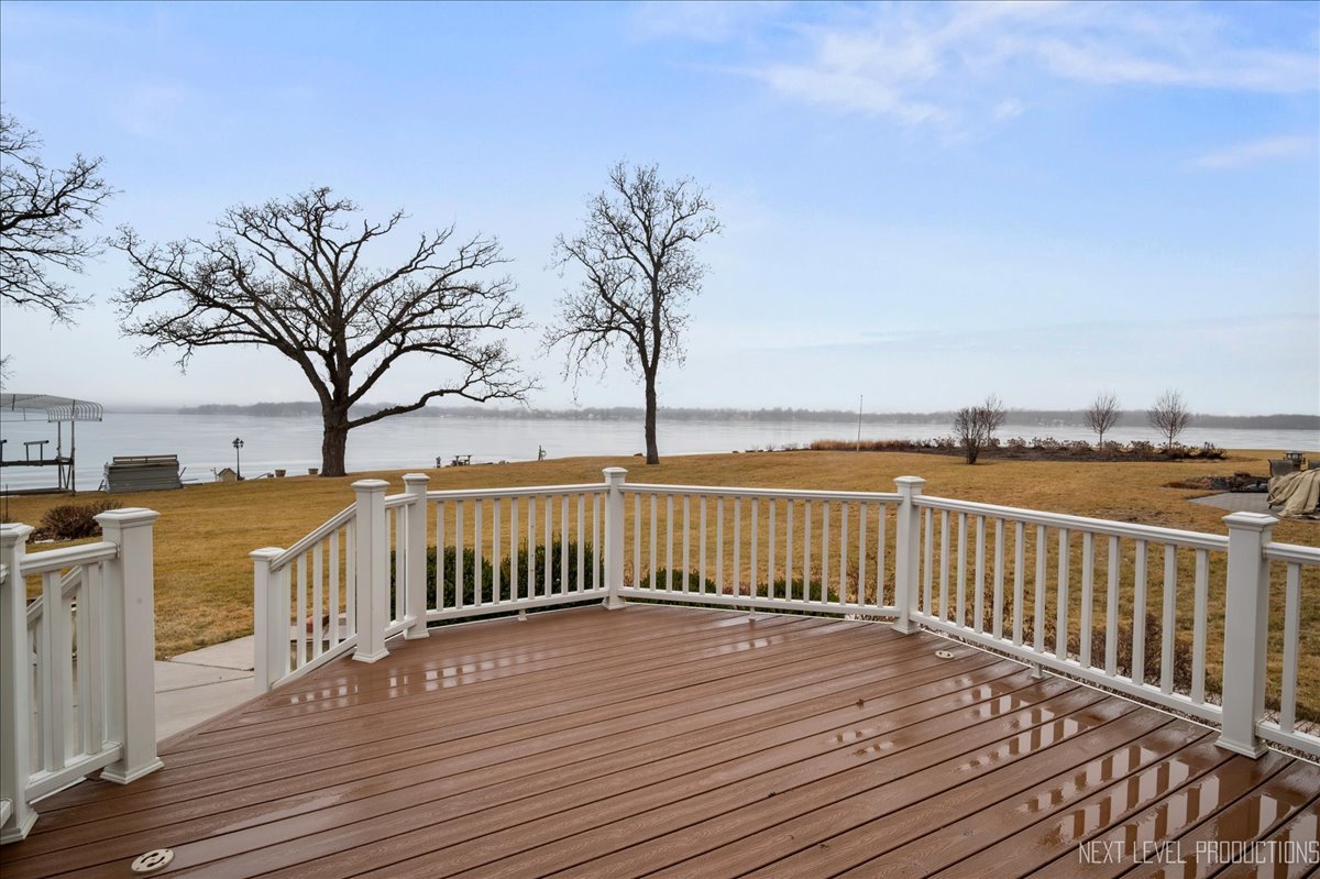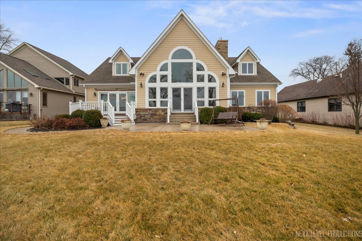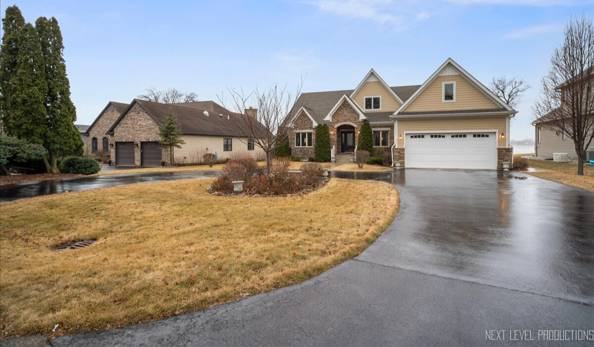 This breathtaking Fox Lake waterfront retreat offers an unparalleled blend of luxury, craftsmanship, and natural beauty, making it the perfect sanctuary for those seeking a life of comfort and serenity. Enhanced with high-end finishes, this home invites you in with a stunning vaulted great room filled with natural light, showcasing expansive arched windows that frame mesmerizing sunset views over the water. Every detail has been meticulously designed, from the beautiful beamed ceiling and the warm glow of hardwood floors to the custom Amish-built maple cabinetry with a glazed finish, providing a timeless and elegant touch. The gourmet kitchen is a chef's dream, featuring high-grade granite countertops with Ogee edging, a spacious island, and a frosted glass pantry door, all seamlessly blending style and function. A Regency 42-inch stone and metal box fireplace with an electric blower adds warmth and charm to the living space, creating the ideal setting for cozy evenings. The luxurious primary suite boasts a spa-like experience with a jetted corner Jacuzzi tub, a separate shower, and double sinks, ensuring a private oasis for relaxation. A second bedroom and full bath are on the first level. Additionally there is a convenient first floor office/den. On the second level there are two additional spacious bedrooms, a large loft, full bath and an expandable attic that offers endless possibilities for customization and growth. Designed for both beauty and durability, the exterior features James Hardie Lifetime warranty siding, custom stonework, and rock-face limestone sills. A Trex deck and patio extend your living space outdoors, where you can enjoy your private 104 feet of Fox Lake shoreline, complete with a maintenance-free L-shaped pier and built-in bench (included) for ultimate lakefront enjoyment. Thoughtful upgrades such as underground electric service to the shore station, aluminum-clad Pella windows with low-E glass, and a LiftMaster oversized garage door opener enhance both convenience and efficiency. This is an oversized 3 car garage. With a circular drive, fully custom landscaping, and a tranquil setting, this home is more than just a residence-it's a lifestyle. This type of property is rarely available.