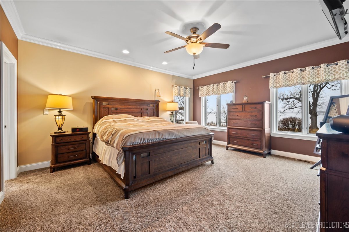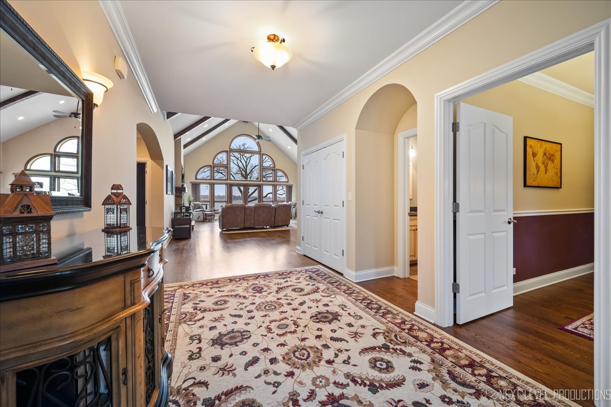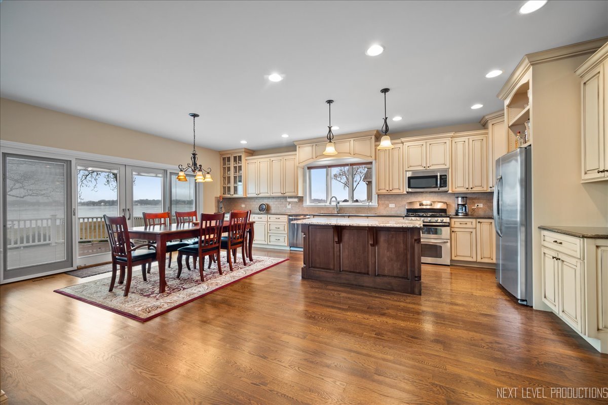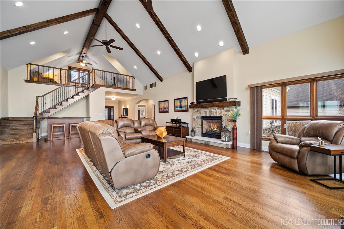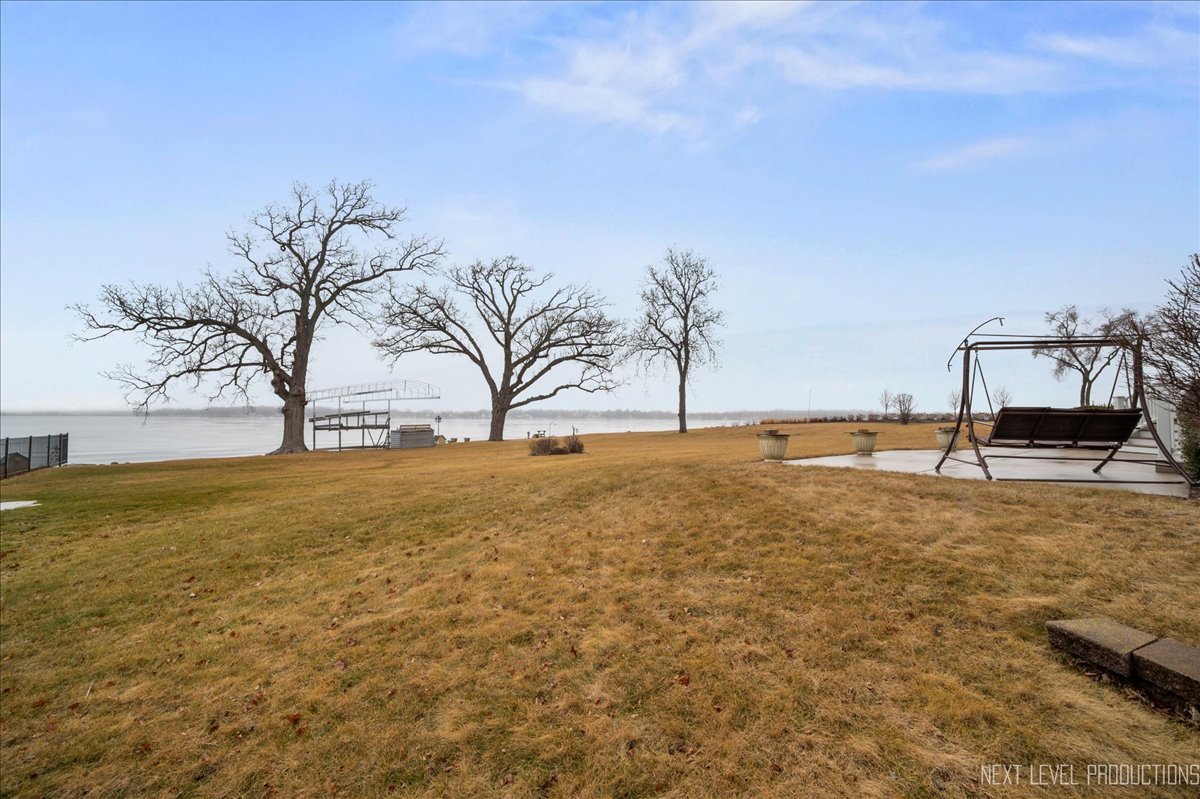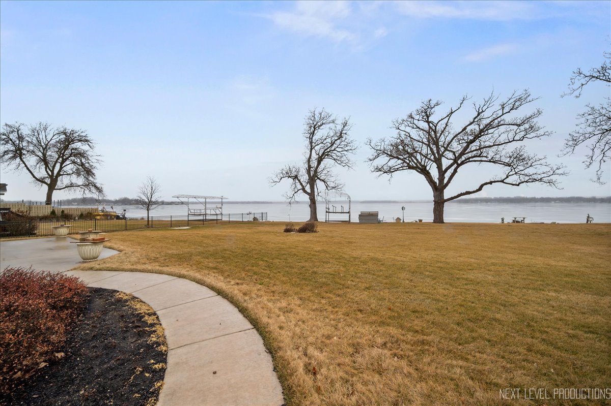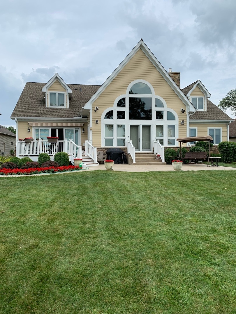 This breathtaking Fox Lake waterfront retreat offers an unparalleled blend of luxury, craftsmanship, and natural beauty, making it the perfect sanctuary for those seeking a life of comfort and serenity. Enhanced with high-end finishes, this home invites you in with a stunning vaulted great room filled with natural light, showcasing expansive arched windows that frame mesmerizing sunset views over the water. Every detail has been meticulously designed, from the beautiful beamed ceiling and the warm glow of hardwood floors to the custom Amish-built maple cabinetry with a glazed finish, providing a timeless and elegant touch. The gourmet kitchen is a chef's dream, featuring high-grade granite countertops with Ogee edging, a spacious island, and a frosted glass pantry door, all seamlessly blending style and function. A Regency 42-inch stone and metal box fireplace with an electric blower adds warmth and charm to the living space, creating the ideal setting for cozy evenings. The luxurious primary suite boasts a spa-like experience with a jetted corner Jacuzzi tub, a separate shower, and double sinks, ensuring a private oasis for relaxation. A second bedroom and full bath are on the first level. Additionally there is a convenient first floor office/den. On the second level there are two additional spacious bedrooms, a large loft, full bath and an expandable attic that offers endless possibilities for customization and growth. Designed for both beauty and durability, the exterior features James Hardie Lifetime warranty siding, custom stonework, and rock-face limestone sills. A Trex deck and patio extend your living space outdoors, where you can enjoy your private 104 feet of Fox Lake shoreline, complete with a maintenance-free L-shaped pier and built-in bench (included) for ultimate lakefront enjoyment. Thoughtful upgrades such as underground electric service to the shore station, aluminum-clad Pella windows with low-E glass, and a LiftMaster oversized garage door opener enhance both convenience and efficiency. This is an oversized 3 car garage. With a circular drive, fully custom landscaping, and a tranquil setting, this home is more than just a residence-it's a lifestyle. This type of property is rarely available.