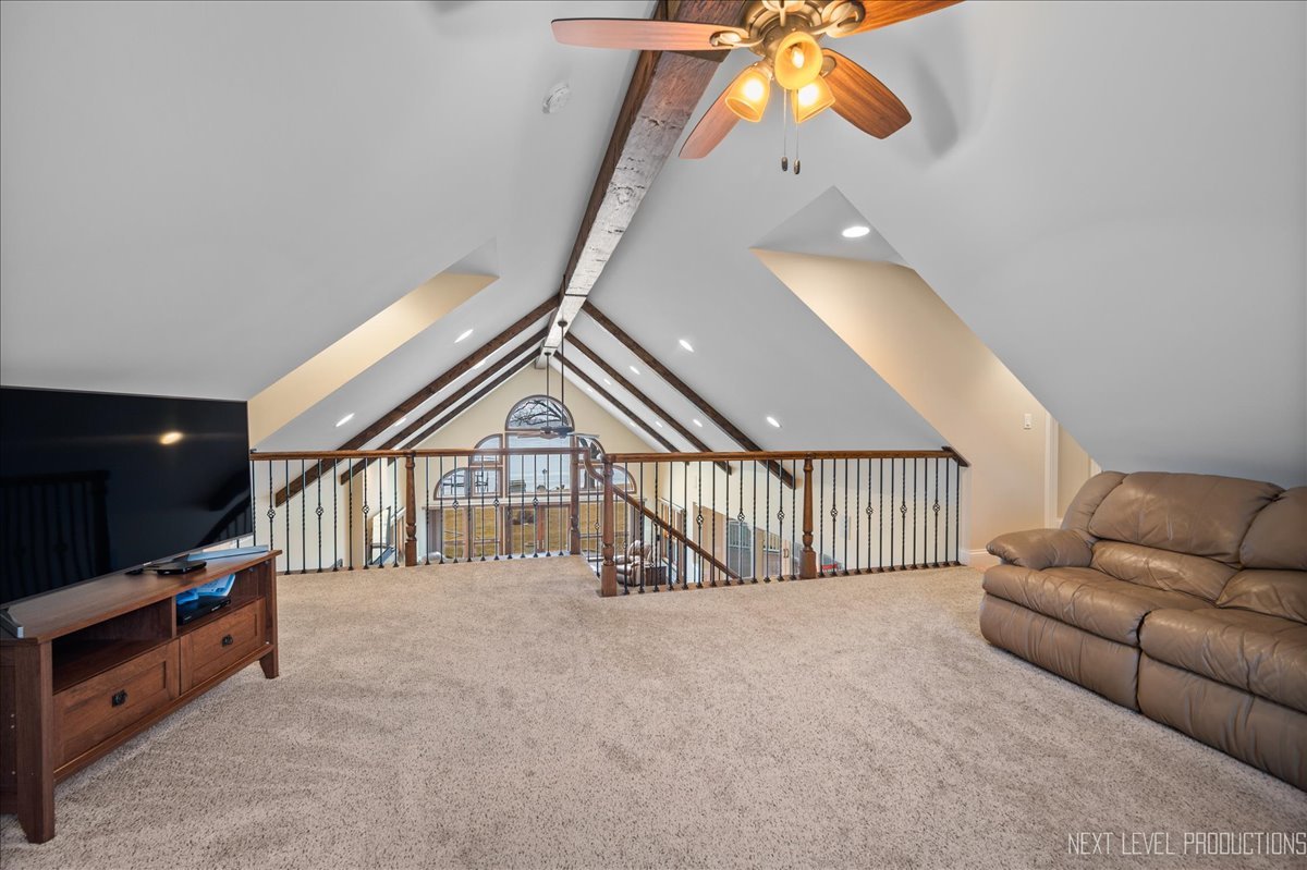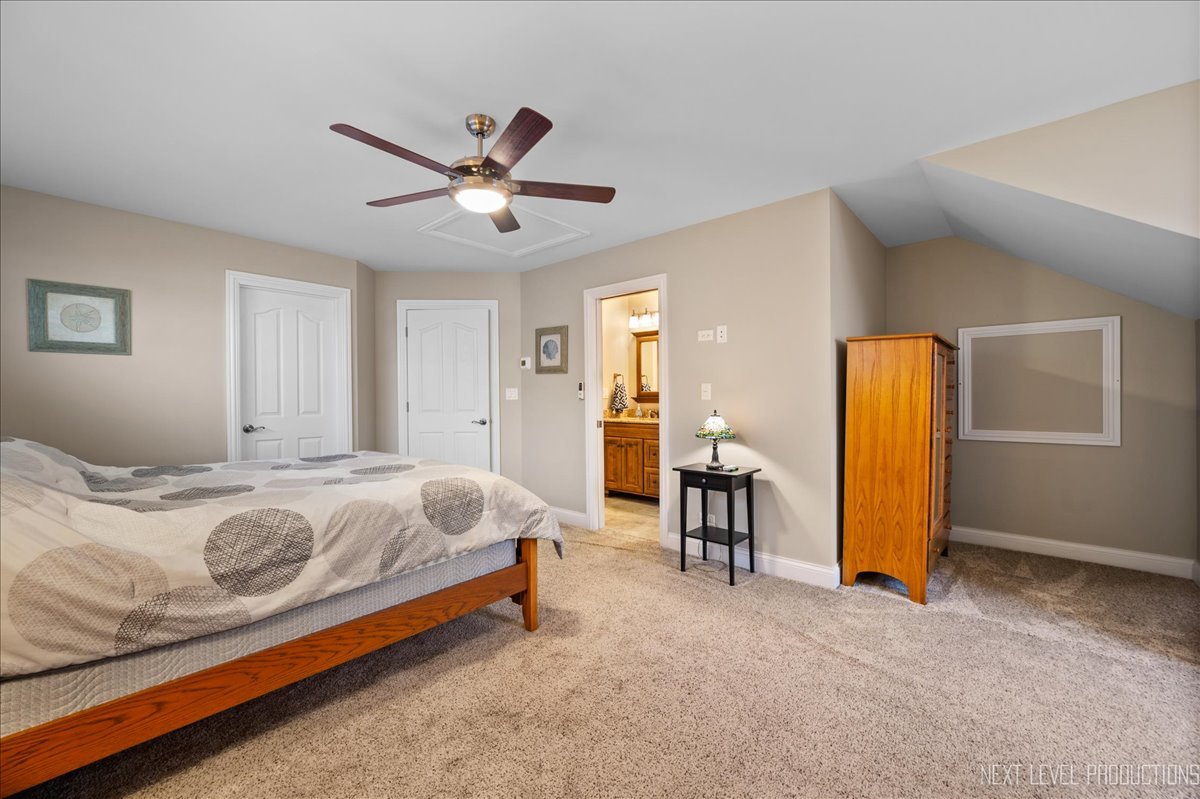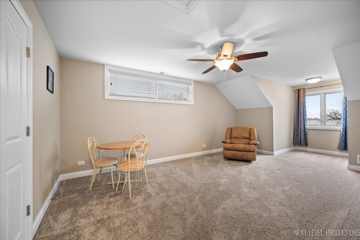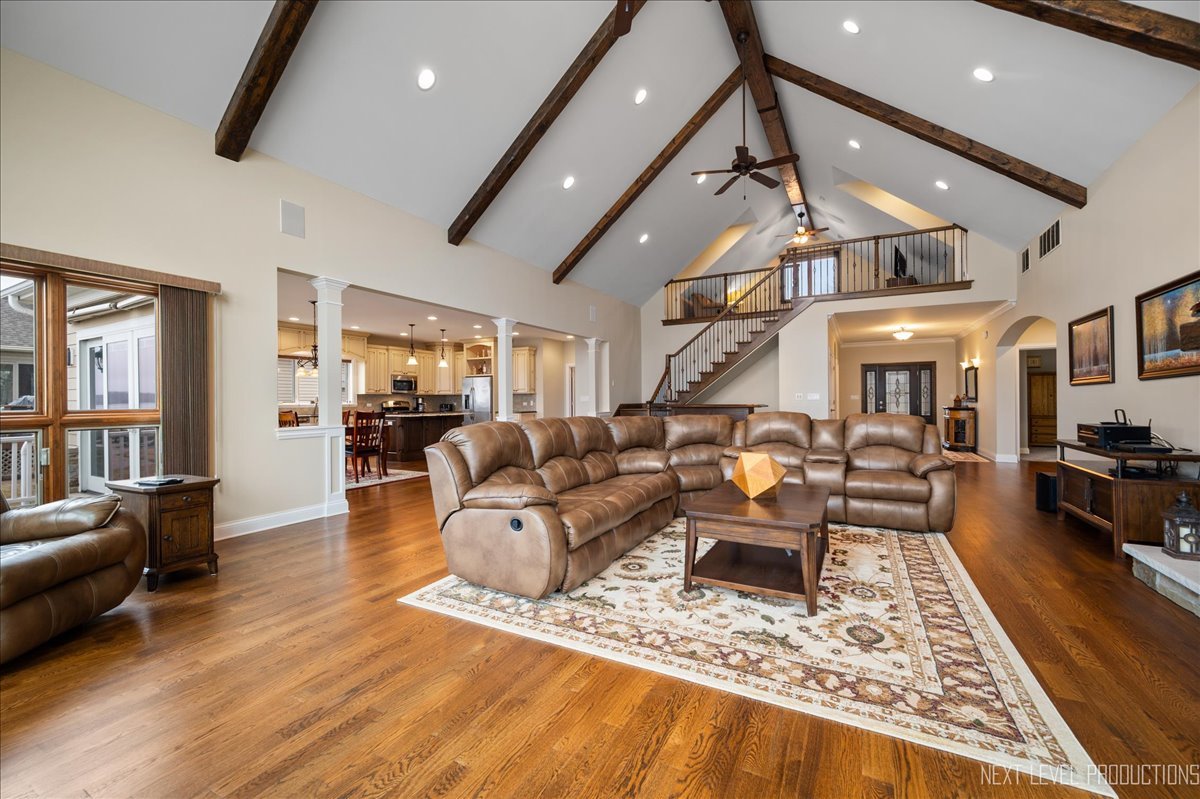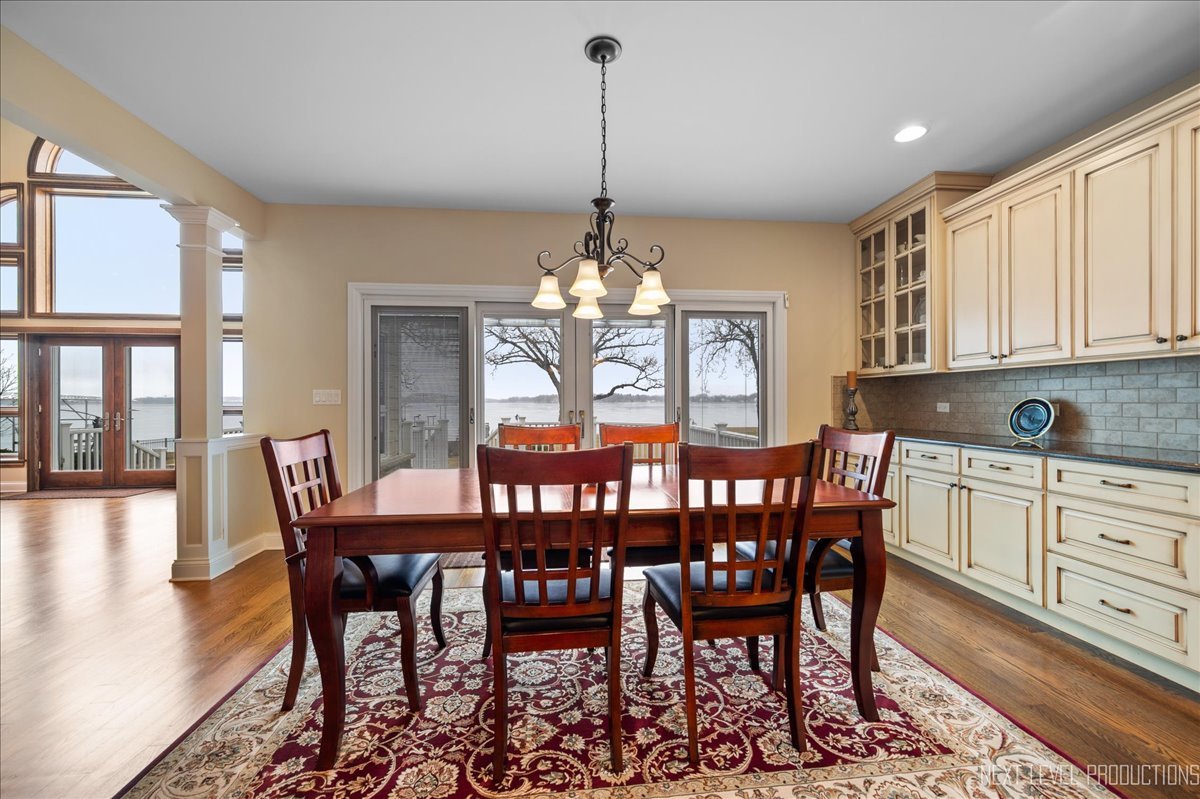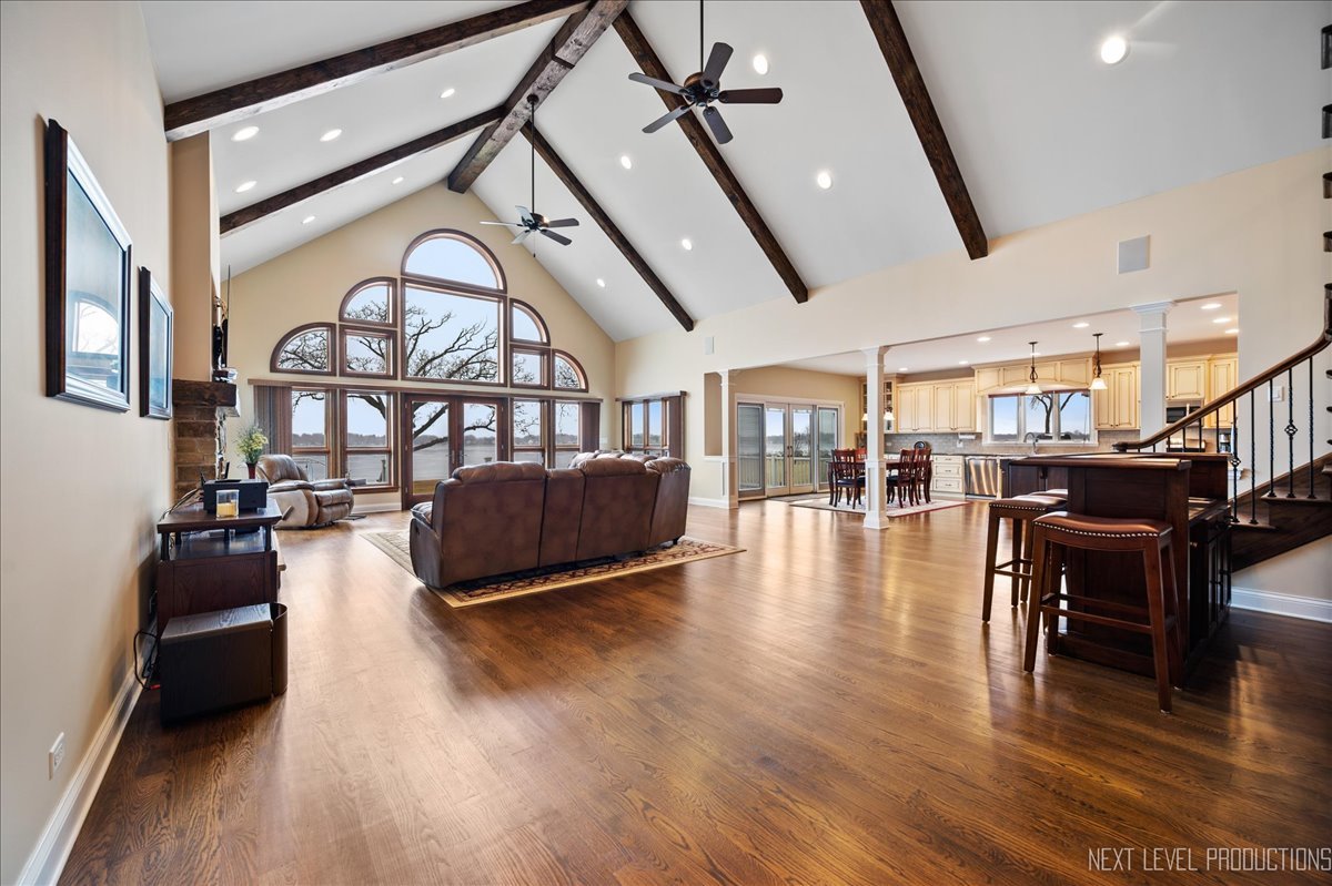 This breathtaking Fox Lake waterfront retreat offers an unparalleled blend of luxury, craftsmanship, and natural beauty, making it the perfect sanctuary for those seeking a life of comfort and serenity. Enhanced with high-end finishes, this home invites you in with a stunning vaulted great room filled with natural light, showcasing expansive arched windows that frame mesmerizing sunset views over the water. Every detail has been meticulously designed, from the beautiful beamed ceiling and the warm glow of hardwood floors to the custom Amish-built maple cabinetry with a glazed finish, providing a timeless and elegant touch. The gourmet kitchen is a chef's dream, featuring high-grade granite countertops with Ogee edging, a spacious island, and a frosted glass pantry door, all seamlessly blending style and function. A Regency 42-inch stone and metal box fireplace with an electric blower adds warmth and charm to the living space, creating the ideal setting for cozy evenings. The luxurious primary suite boasts a spa-like experience with a jetted corner Jacuzzi tub, a separate shower, and double sinks, ensuring a private oasis for relaxation. A second bedroom and full bath are on the first level. Additionally there is a convenient first floor office/den. On the second level there are two additional spacious bedrooms, a large loft, full bath and an expandable attic that offers endless possibilities for customization and growth. Designed for both beauty and durability, the exterior features James Hardie Lifetime warranty siding, custom stonework, and rock-face limestone sills. A Trex deck and patio extend your living space outdoors, where you can enjoy your private 104 feet of Fox Lake shoreline, complete with a maintenance-free L-shaped pier and built-in bench (included) for ultimate lakefront enjoyment. Thoughtful upgrades such as underground electric service to the shore station, aluminum-clad Pella windows with low-E glass, and a LiftMaster oversized garage door opener enhance both convenience and efficiency. This is an oversized 3 car garage. With a circular drive, fully custom landscaping, and a tranquil setting, this home is more than just a residence-it's a lifestyle. This type of property is rarely available.
