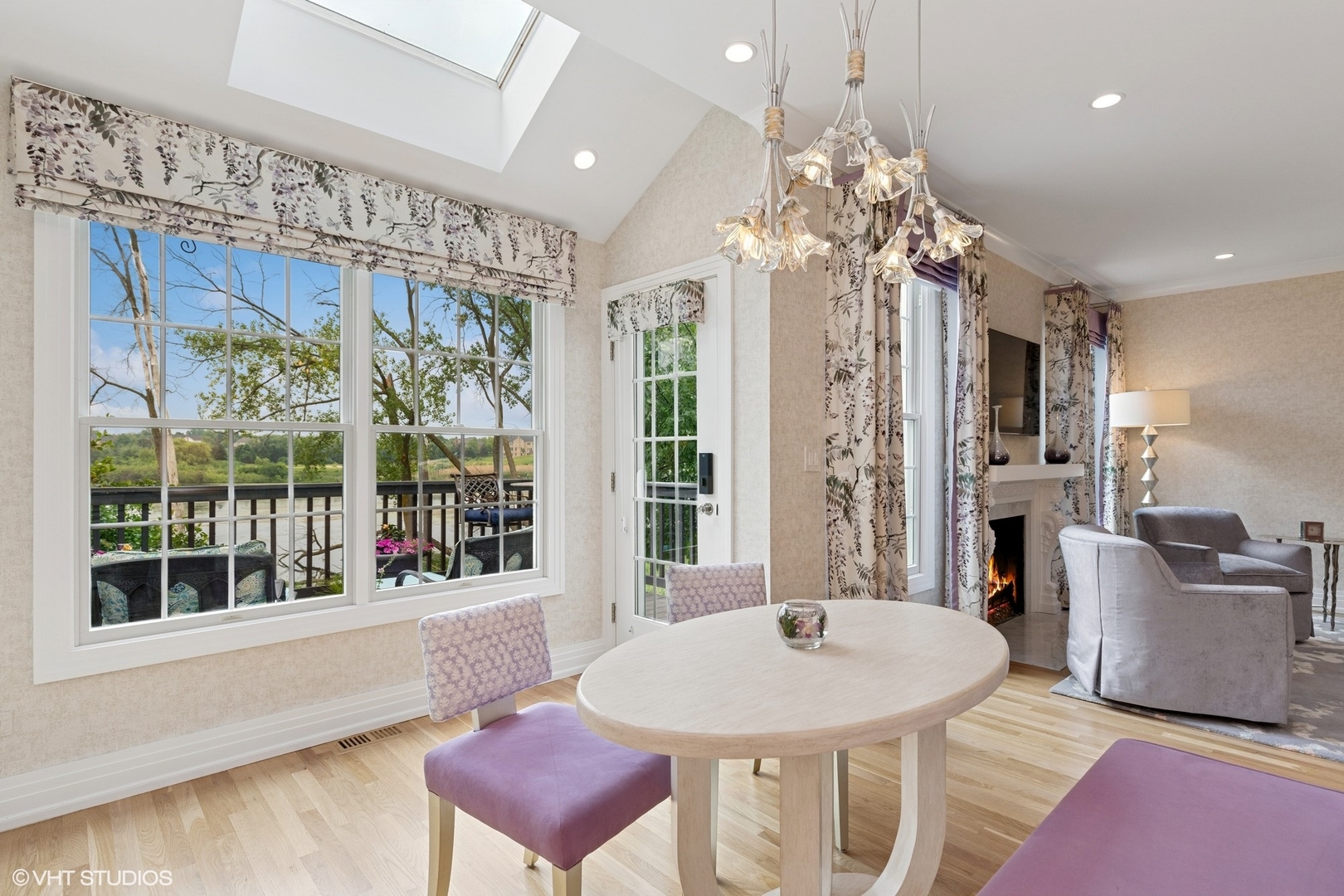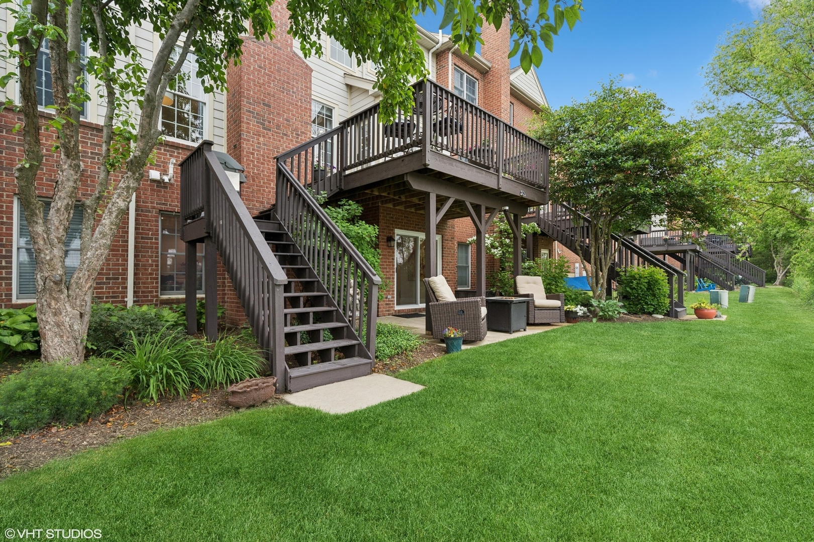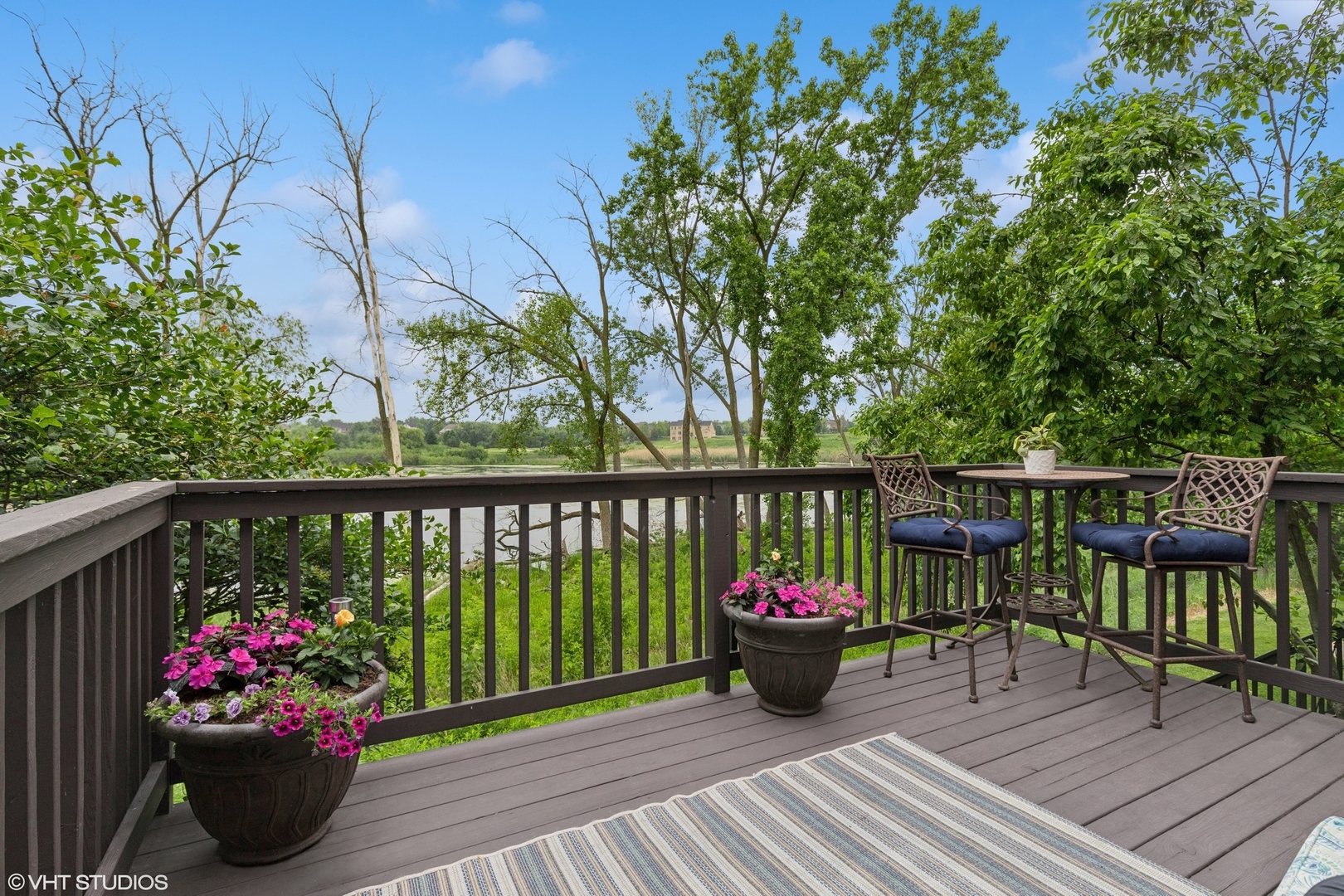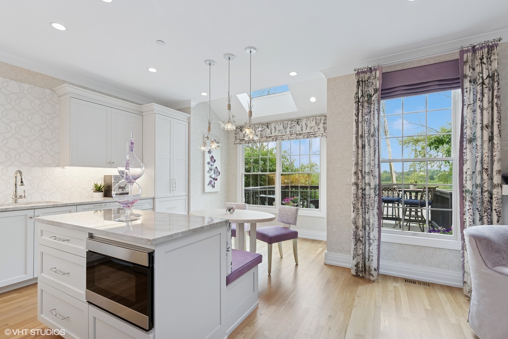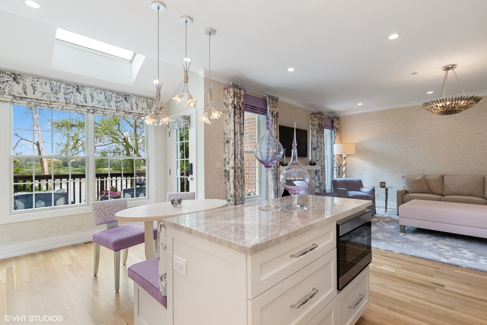 Better than new luxury living in Hawthorn Woods Country Club, redesigned for elevated living and elegant entertaining, putting it in a class of its own. Unlike any other unit, the sophisticated multi-level interior has been masterfully renovated and upgraded with an unobstructed, open floor plan meticulously crafted in exquisite appointments including upgraded custom millwork, cabinetry and vanities, fresh paint and professionally hung wall coverings, stone countertops, polished nickel plumbing fixtures, cabinet and door hardware, skirted toilets, designer tile and flooring, bespoke lighting fixtures, and custom designed window coverings. Celebrating impeccable attention to detail, one is greeted by an expanse of modern luxury. Striking, refinished white oak flooring seamlessly unifies the expansive, main floor living space clad in a designer wall covering, offering a transitional dining room, spacious living room with a new fireplace surround and mantle, and an eat-in kitchen providing direct access to the elevated back deck. Abundant windows flood the interior with natural light and deliver a vital connection to the outdoors. Sparing no expense, the completely redesigned kitchen is fully appointed with new stainless-steel appliances, including a Thermador Range and dishwasher, Samsung refrigerator, and Sharp microwave drawer built-in to the perfectly positioned island, which doubles as custom banquette seating. Noteworthy features include Tri-Star custom cabinetry dressed with Classic Brass hardware, Fine Art Azu pendant lights, Taj Mahal quartzite countertops, and a show-stopping backsplash of Cordelia White Thassos Marble and Mother-of-Pearl. The stunning combination offers the perfect canvas for culinary creations. The splendor continues in the brilliant powder room covered in gorgeous grasscloth panels accented by Wallquest's Daisy Bennet Butterfly Delight mural and an Azu four-light sconce by Fine Art, featuring a custom vanity, quartzite countertop and Newport Brass plumbing fixtures The first-floor laundry room is an undetectable utility space coated in Mokum wall covering, with porcelain tile flooring and custom cabinets, Oyster White marble countertop, a clothes drying bar and LG full-size stackable washer/dryer. Upstairs, the exquisite primary suite is a truly luxe space housing a walk-in closet outfitted by Closets By Design with Schonbek Petit Crystal Deluxe lighting. The soothing sanctuary of neutral decor is enhanced by Phillip Jeffries Blossom mural and a Schonbek crystal chandelier hanging down from the vaulted ceiling. The tranquil, primary bathroom continues to impress with custom cabinetry, double sinks, Kohler polished nickel plumbing fixtures, and Taj Mahal countertops, enhanced by white thassos marble flooring, shower walls and bench, including a custom mosaic in the shower floor and niche, and a built-in make-up vanity. Continuing through the second floor, two additional bedrooms are lit by Schonbek designer lighting fixtures. An aesthetically pleasing walk-out lower level provides the ultimate overflow space for gatherings of all sizes including an area for dining or playing your favorite board game, a comfortable family room warmed by an electric fireplace, and a full bathroom outfitted with a custom vanity and mirrors, leathered Manhattan marble countertop, a mosaic shower floor, mother-of-pearl shower wall tile and Kohler fixtures and shower system. Outside, nature's grandeur has been uninterrupted, providing a private, peaceful escape to be enjoyed any time of year. This is a golden opportunity to own a spectacular townhome in one of the most highly desired golf course communities in the Chicagoland area.