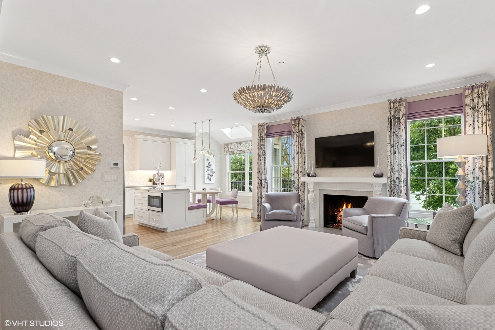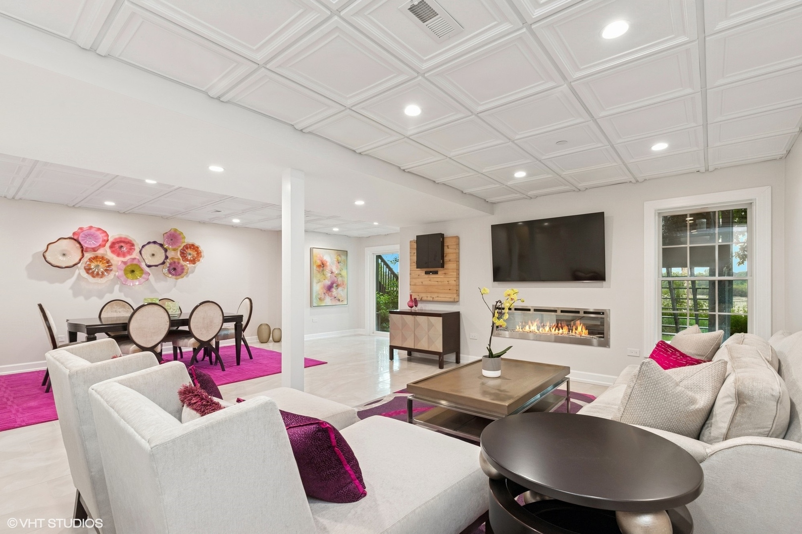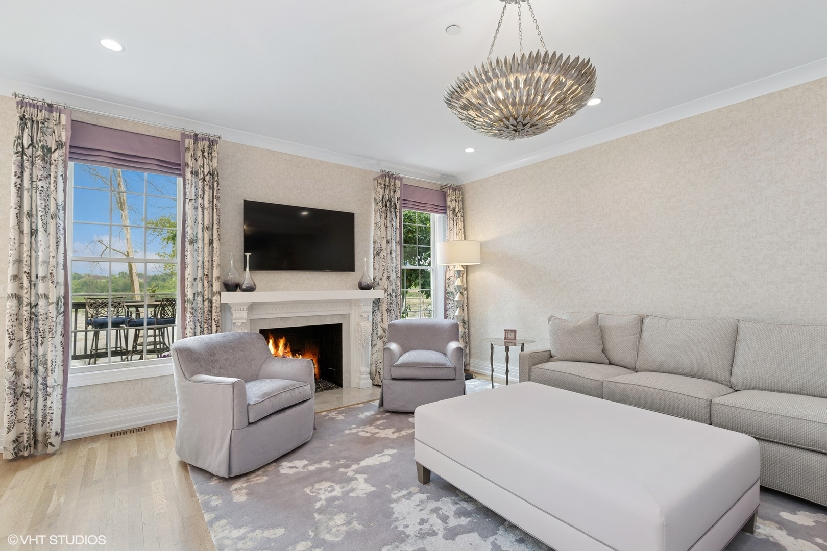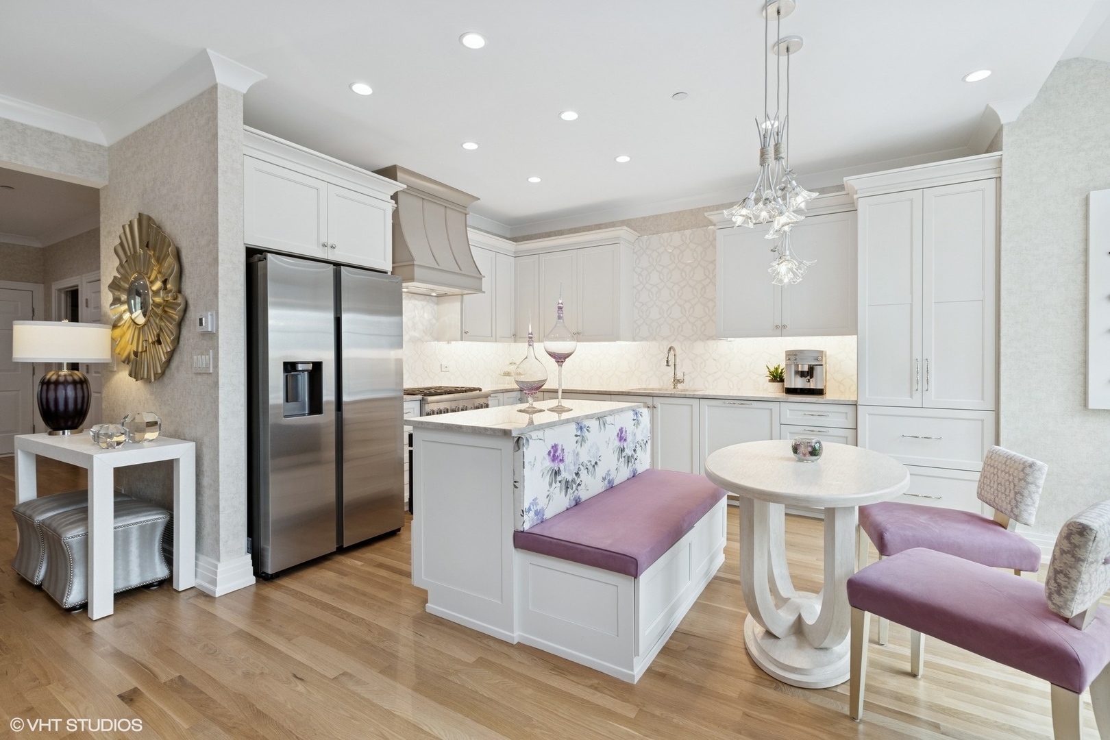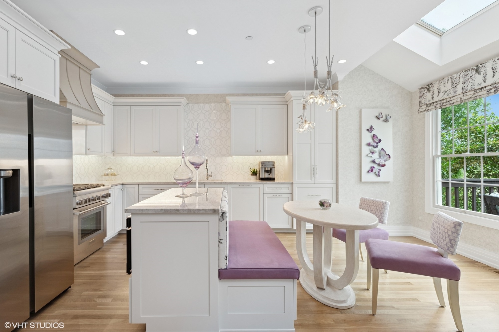 Better than new luxury living in Hawthorn Woods Country Club, redesigned for elevated living and elegant entertaining, putting it in a class of its own. Unlike any other unit, the sophisticated multi-level interior has been masterfully renovated and upgraded with an unobstructed, open floor plan meticulously crafted in exquisite appointments including upgraded custom millwork, cabinetry and vanities, fresh paint and professionally hung wall coverings, stone countertops, polished nickel plumbing fixtures, cabinet and door hardware, skirted toilets, designer tile and flooring, bespoke lighting fixtures, and custom designed window coverings. Celebrating impeccable attention to detail, one is greeted by an expanse of modern luxury. Striking, refinished white oak flooring seamlessly unifies the expansive, main floor living space clad in a designer wall covering, offering a transitional dining room, spacious living room with a new fireplace surround and mantle, and an eat-in kitchen providing direct access to the elevated back deck. Abundant windows flood the interior with natural light and deliver a vital connection to the outdoors. Sparing no expense, the completely redesigned kitchen is fully appointed with new stainless-steel appliances, including a Thermador Range and dishwasher, Samsung refrigerator, and Sharp microwave drawer built-in to the perfectly positioned island, which doubles as custom banquette seating. Noteworthy features include Tri-Star custom cabinetry dressed with Classic Brass hardware, Fine Art Azu pendant lights, Taj Mahal quartzite countertops, and a show-stopping backsplash of Cordelia White Thassos Marble and Mother-of-Pearl. The stunning combination offers the perfect canvas for culinary creations. The splendor continues in the brilliant powder room covered in gorgeous grasscloth panels accented by Wallquest's Daisy Bennet Butterfly Delight mural and an Azu four-light sconce by Fine Art, featuring a custom vanity, quartzite countertop and Newport Brass plumbing fixtures The first-floor laundry room is an undetectable utility space coated in Mokum wall covering, with porcelain tile flooring and custom cabinets, Oyster White marble countertop, a clothes drying bar and LG full-size stackable washer/dryer. Upstairs, the exquisite primary suite is a truly luxe space housing a walk-in closet outfitted by Closets By Design with Schonbek Petit Crystal Deluxe lighting. The soothing sanctuary of neutral decor is enhanced by Phillip Jeffries Blossom mural and a Schonbek crystal chandelier hanging down from the vaulted ceiling. The tranquil, primary bathroom continues to impress with custom cabinetry, double sinks, Kohler polished nickel plumbing fixtures, and Taj Mahal countertops, enhanced by white thassos marble flooring, shower walls and bench, including a custom mosaic in the shower floor and niche, and a built-in make-up vanity. Continuing through the second floor, two additional bedrooms are lit by Schonbek designer lighting fixtures. An aesthetically pleasing walk-out lower level provides the ultimate overflow space for gatherings of all sizes including an area for dining or playing your favorite board game, a comfortable family room warmed by an electric fireplace, and a full bathroom outfitted with a custom vanity and mirrors, leathered Manhattan marble countertop, a mosaic shower floor, mother-of-pearl shower wall tile and Kohler fixtures and shower system. Outside, nature's grandeur has been uninterrupted, providing a private, peaceful escape to be enjoyed any time of year. This is a golden opportunity to own a spectacular townhome in one of the most highly desired golf course communities in the Chicagoland area.
